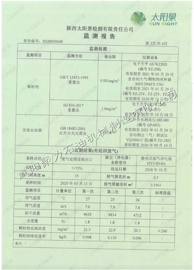 依據(jù)GB 9078-1996《工業(yè)爐窯大氣污染物排放標(biāo)準(zhǔn)》表2"熱處理爐二級(jí)”、GB 16297-1996《大氣污染物綜合排放標(biāo)準(zhǔn)》表2“無(wú)組織排放”及GB 18483-2001《飲食業(yè)油煙排放標(biāo)準(zhǔn)》表2的要求,本次監(jiān)測(cè)結(jié)果符合要求。